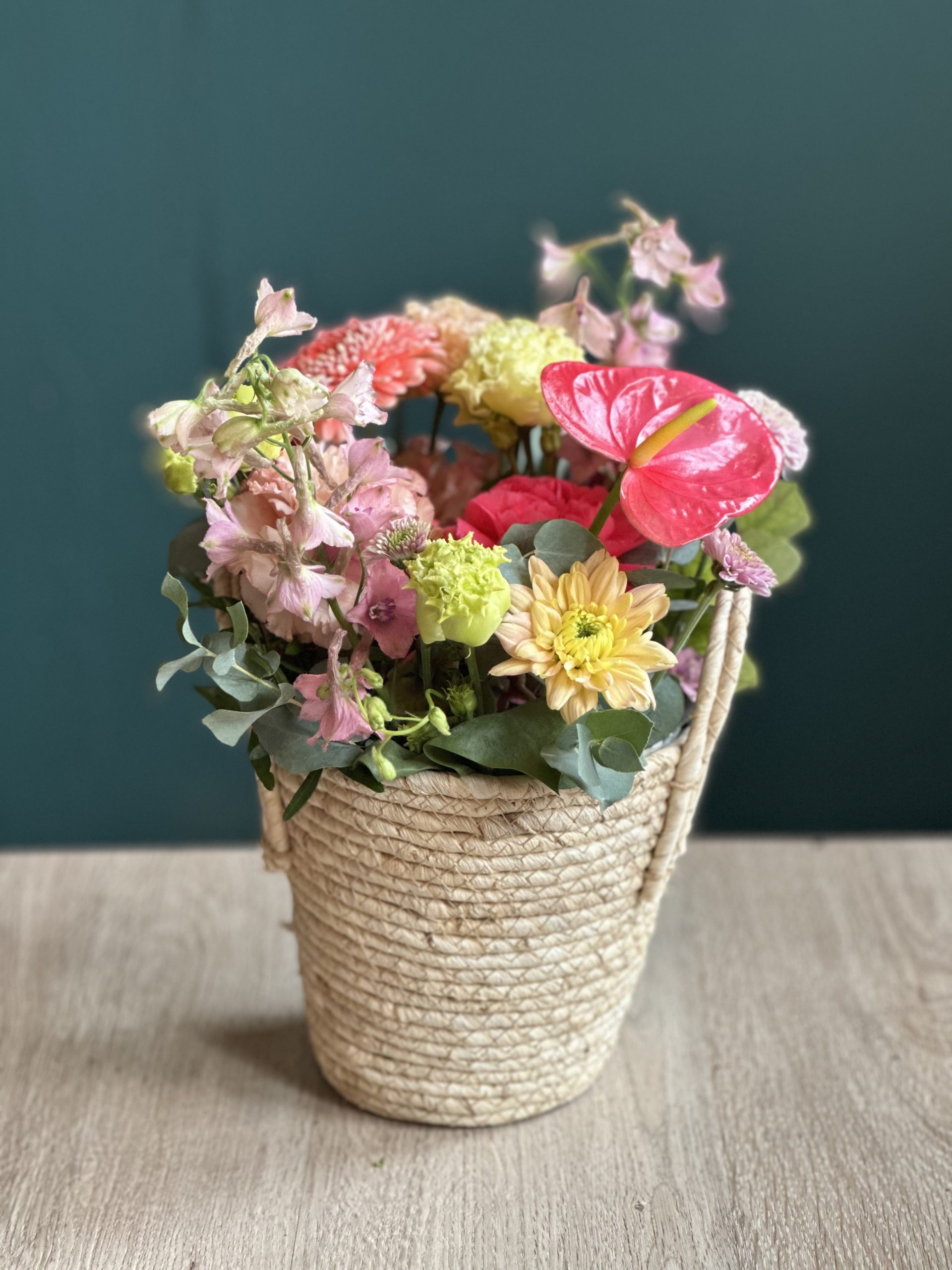 Pétillant avec ces couleurs rose-abricot de cet arrangement floral. Les fleurs s’entrelacent avec légèreté dans un très joli panier ou autre contenant (selon disponibilité du fleuriste).