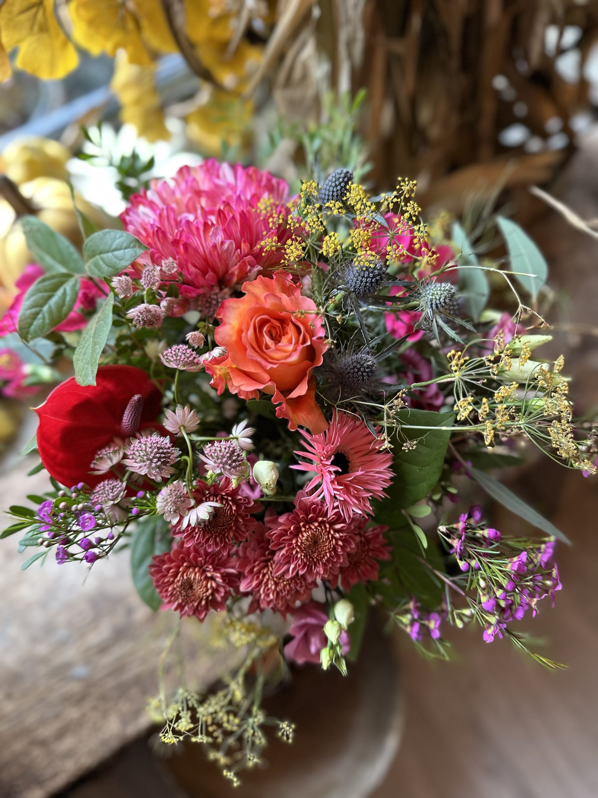 Un bouquet audacieux et lumineux, idéal pour offrir ou se faire plaisir. Ses nuances chaudes et sa structure généreuse en font une création pleine de caractère, symbole de joie et d’énergie.